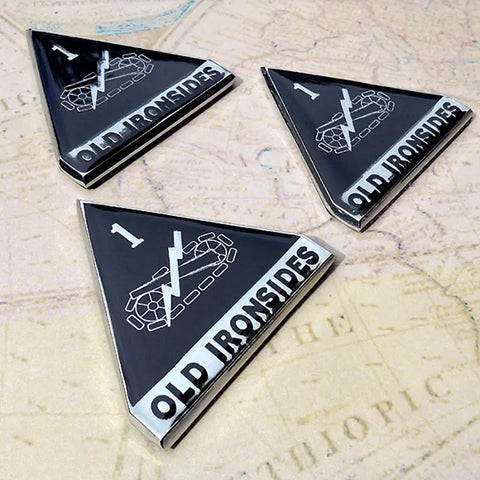 The 1st Armored Division's commitment to the civic and military values for which "Old Ironsides" has been renowned for half a century (patriotism, discipline, readiness, self-sacrifice, combined arms cooperation, shock action, decisiveness, and generosity in victory) remains relentlessly strong today. The insignia is designed from the triangular coat-of-arms of the American World War II Tank Corps. Superimposed on the triangle is the insignia of the former Seventh Cavalry Brigade (Mechanized), the predecessors of the Old Ironsides. The tank track represents mobility and armor protection, the gun denotes firepower, and the chain of lightening symbolizes speed and shock action. Mobility, firepower, and shock action are the basic attributes of Armor.